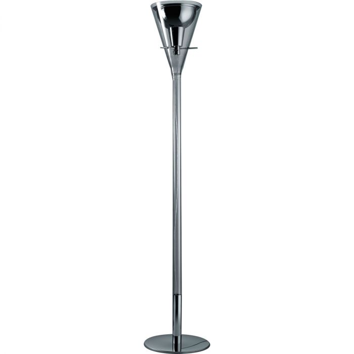 Le lampadaire se caractérise par le contraste de ses matériaux : la douceur et la transparence du verre s'opposent à la force de l'aluminium chromé. Le cône de verre accueille en son interne le réflecteur, soutenu par trois bras chromés. La lumière se reflète à l’intérieur du cône et se diffuse de manière uniforme vers le haut.