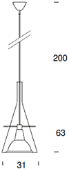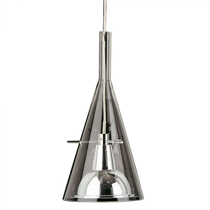 Le cône de verre accueille en son interne le réflecteur, soutenu par trois bras chromés. La lumière se reflète à l’intérieur du cône et se diffuse de manière uniforme vers le haut.