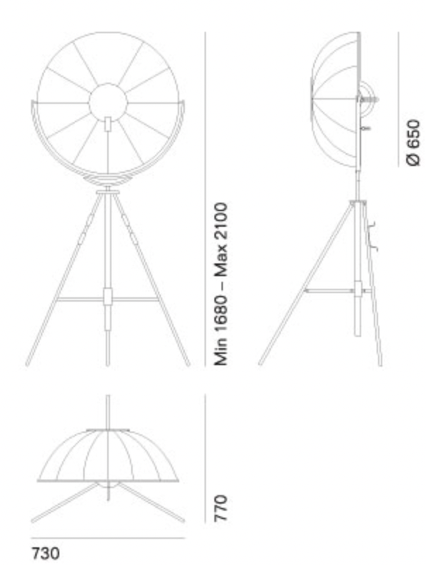H totale : de 168 à 210 cm x larg 73 cm (ouverture trépied) x prof 77 cm