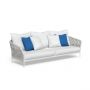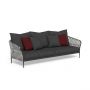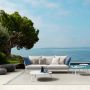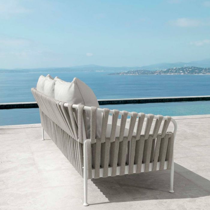 Le sofa 3 places de la collection Frame rappelle tous les éléments distinctifs de la collection. La structure tubulaire en aluminium unit la praticité d’un matériau résistant aux agents atmosphériques à l’élégance de ses formes sinueuses. L’assise, solide et accueillante, se caractérise par une sélection de tissus épais et denses, également utilisés pour la coussinerie accueillante et volumineuse du dossier. Les coussins ornementaux créent un jeu de proportions qui ajoute à la séduction de l’ensemble. Un détail incomparable de la collection est celui des cordes rembourrées tressées sur la structure des accoudoirs et du dossier, qui donne à ce canapé un aspect élégant et sensuel.