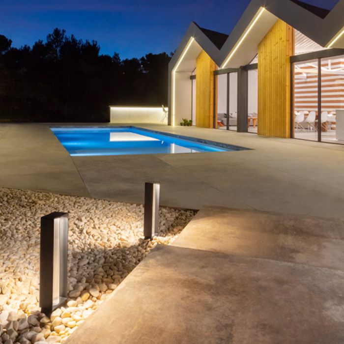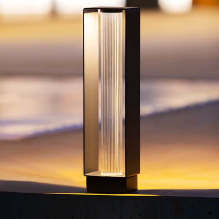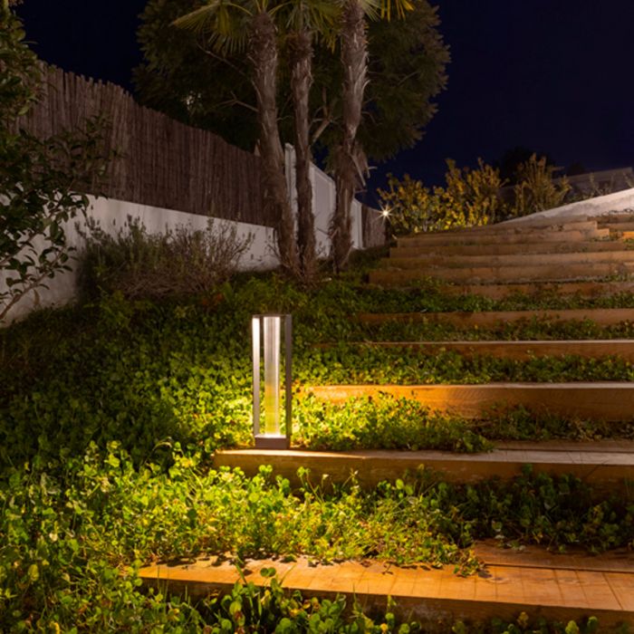 Borne lumineuse d'extérieur métallique avec pyrex transparent et diffuseur en verre. LED intégrée fournissant une lumière directe et indirecte. Revêtement double couche pour une haute résistance à la corrosion et d'autres conditions environnementales. Câblé (pas de prise)