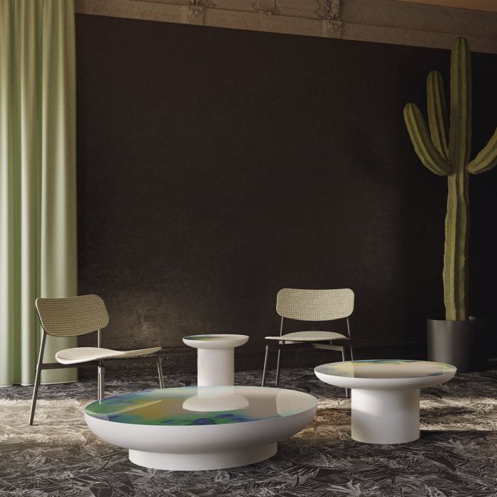 Francis Table de Petite Friture par Constance Guisset. Les tables Francis sont issues d’une expérience sur les pigments, de la vision fugace de couleurs fuyants du pinceau au contact de l’eau. Evoquant l’oxydation des miroirs anciens, revue en une interprétation lumineuse empreinte de modernité.