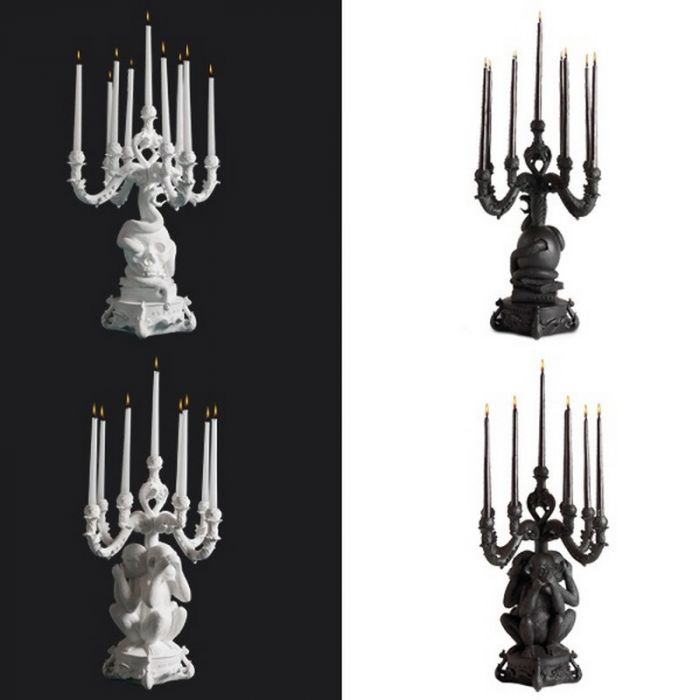 Ce chandelier de Seletti pour 9 bougies est baroque et surréaliste. La résine a remplacé le laiton, le marbre ou la porcelaine ; les volutes et feuillages en reliefs sont aux antipodes du minimalisme actuel. Les motifs qui composent le corps du chandelier sont loin des standards traditionnels du XVIIIe siècle avec un crâne percé par un serpent et 3 singes accroupis. Une création contemporaine atypique !