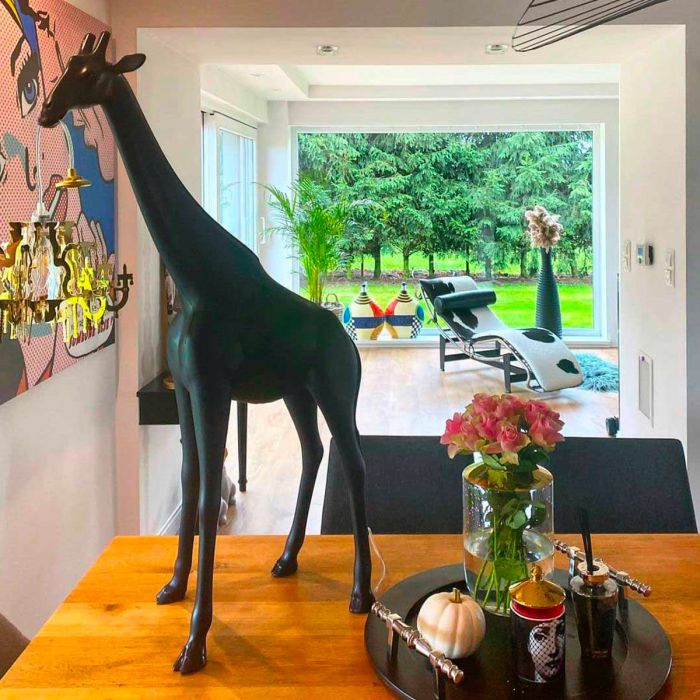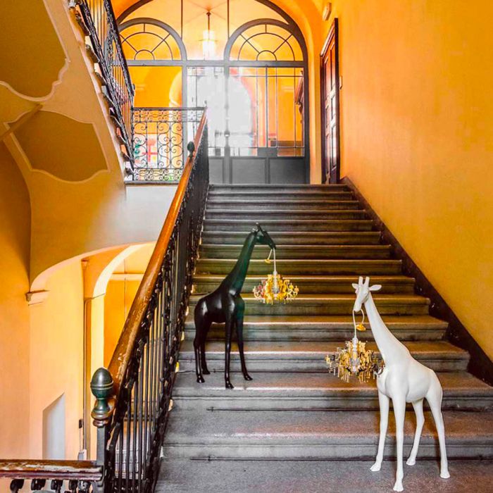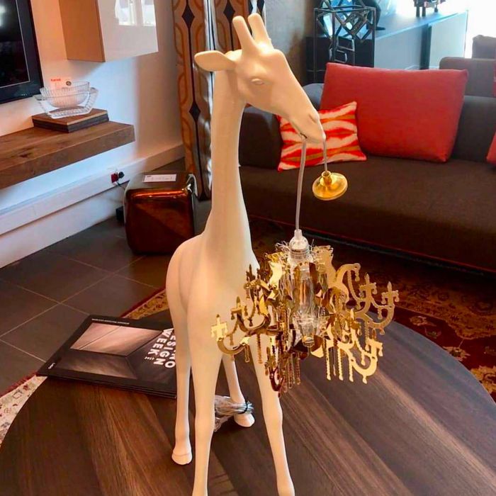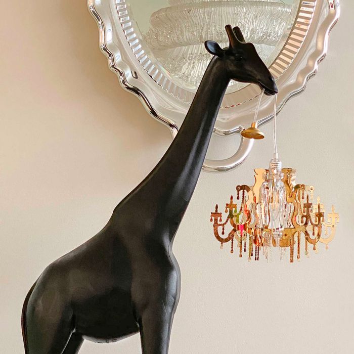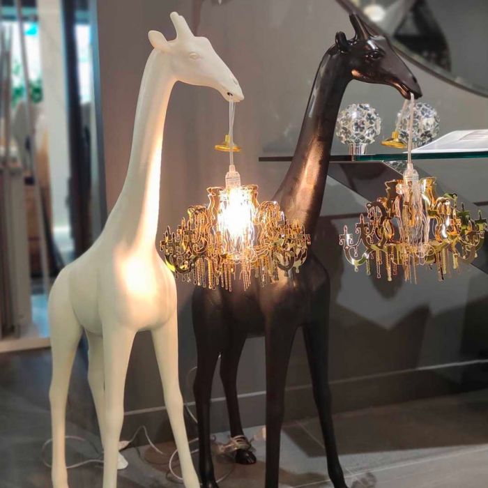Giraffe in love de Qeeboo. Giraffe In Love XS, conçue par Marcantonio, est une girafe qui tient un lustre de style Marie-Thérèse, en version miniature. La lampe girafe devient un objet design polyvalent et ludique qui saura éloigner tout stress de votre bureau.