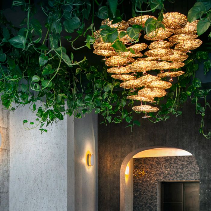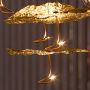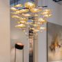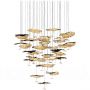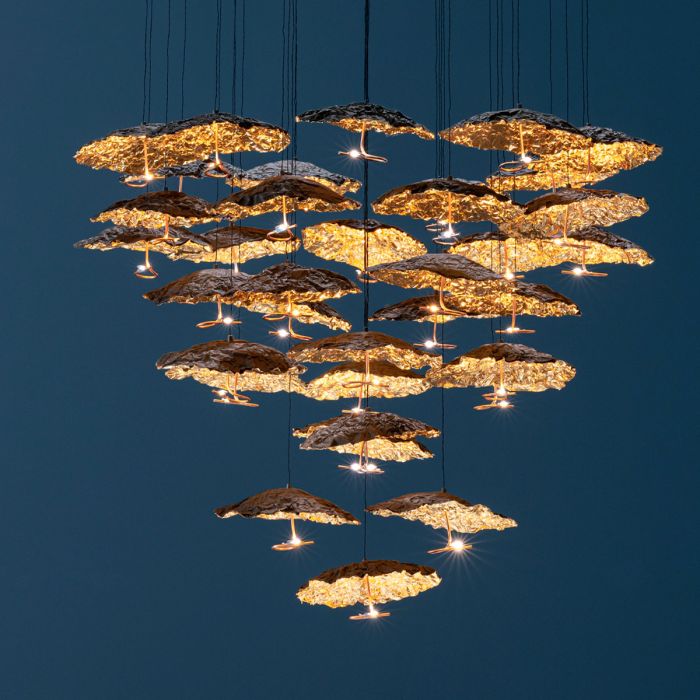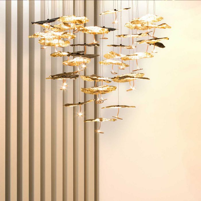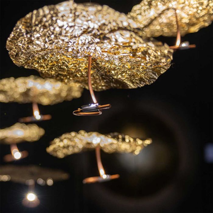 Extraordinaire, extravagant. Le lustre "Gold Moon Chandelier" de Catellani & Smith se présente avec élégance. Une œuvre d'art d'un genre particulier apparaît à la fois magnifique et en filigrane. Au total, des têtes lumineuses brillent avec les dernières ampoules à LED, les minces disques en aluminium presque flottants, qui sont recouverts de feuilles noires et dorées. Comme des petits nuages de formes différentes avec une feuille d'or froissée, qui sert de réflecteur, ainsi qu'une feuille noire au sommet, chaque tête de lumière apparaît, disposée à différentes hauteurs. La plaque de plafond ronde est en acier satiné. Avec une commande TRIAC, l’objet lumière peut être infiniment atténué.