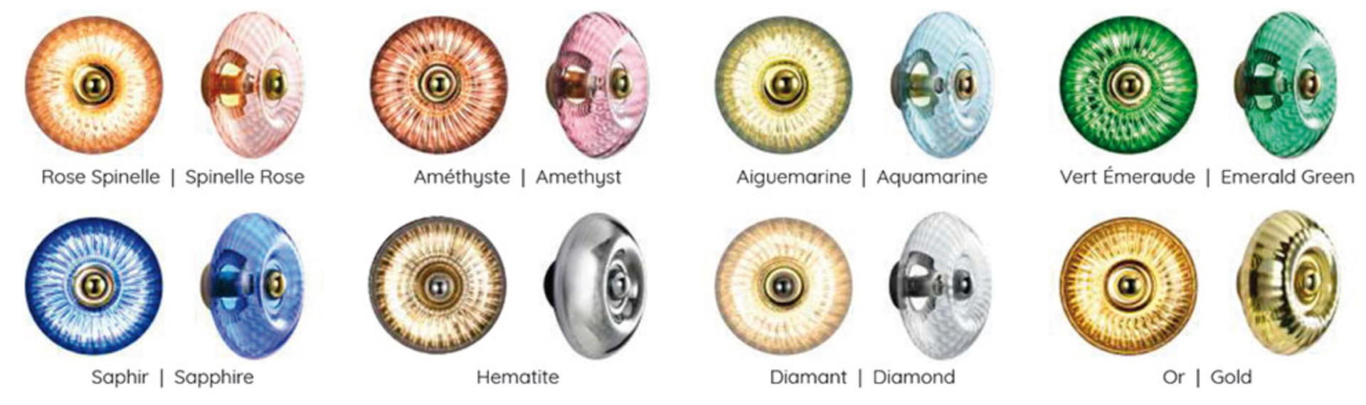 Finitions : Rose Spinelle, Améthyste, Aigue-Marine, Vert Émeraude, Saphir, Diamant/ Chrome, Diamant/ Doré, Hématite, Or ou jaune ocre (Topaze)