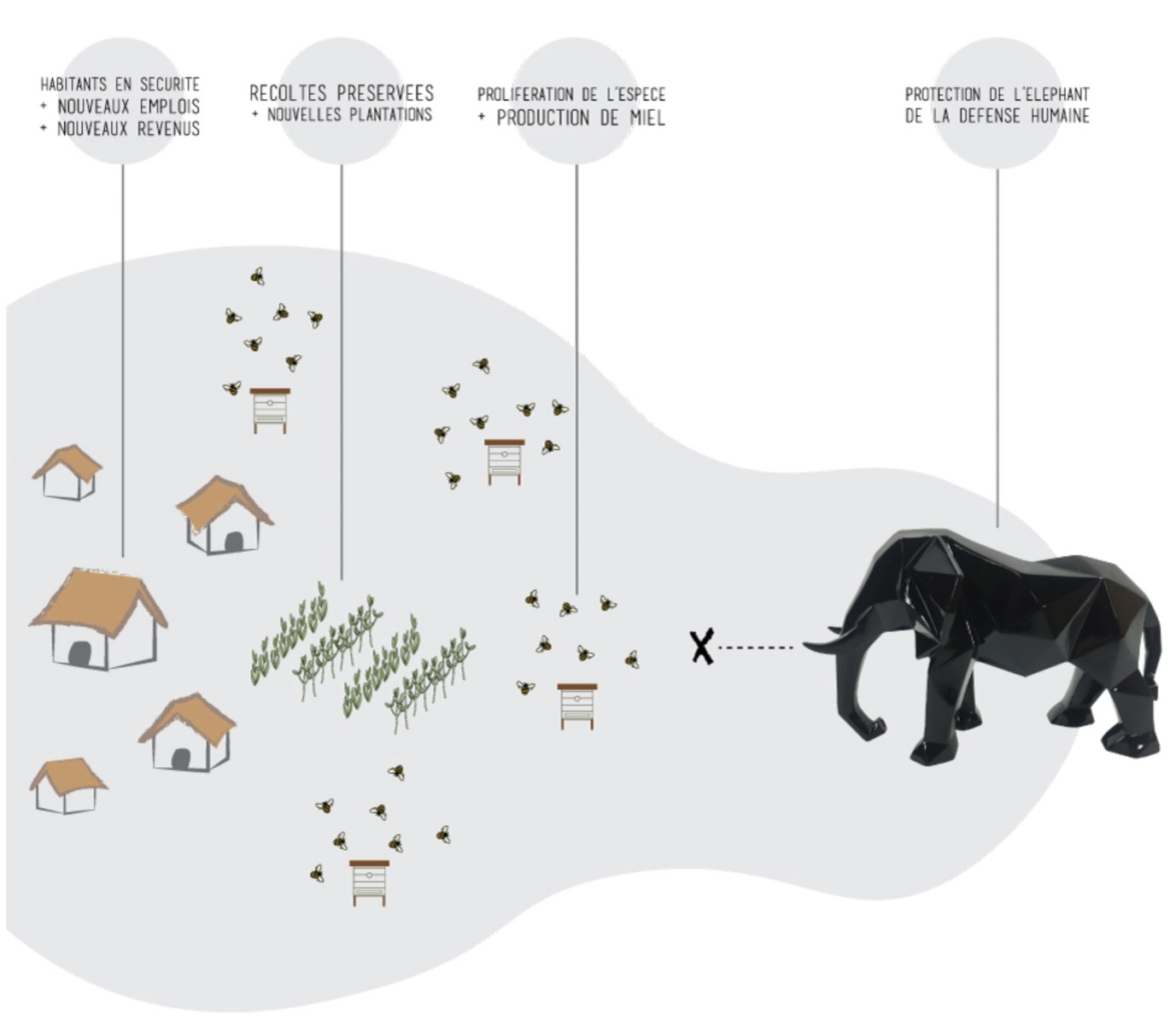 Le projet est né d'une étude novatrice utilisant une compréhension approfondie du comportement des éléphants. Afin de réduire les dommages causés par les éléphants ravageurs, utilisant leur peur instinctive des abeilles africaines. Le projet explore l'utilisation de ruches en tant que dissuasion naturelle des éléphants, créant une stimulation sociale et économique dans les communautés rurales frappées par la pauvreté, grâce à des services de pollinisation et à la récolte durable du «miel amoureux des éléphants».