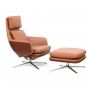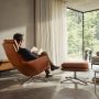 Grand Relax est un fauteuil inclinable luxueux alliant un confort exceptionnel à des dimensions compactes et une esthétique classique épurée. L‘expérience d‘assise exceptionnelle offerte par ce fauteuil résulte de l‘interaction harmonieuse de divers composants et de sa conception en tant que meuble rembourré. Des revêtements en cuir de haute qualité recouvrent les coussins d‘assise et de dossier souples qui reposent librement sur le fauteuil. Ils enveloppent confortablement l‘utilisateur et retrouvent cependant toujours leur forme d‘origine. En s‘asseyant, l‘utilisateur s‘enfonce lentement dans les coussins, tandis qu‘un mécanisme intégré dissimulé absorbe le poids et fait coulisser le fauteuil en position inclinée. L‘assise et le dossier se déplacent indépendamment, dans un mouvement synchrone. Un bouton de commande permet de régler la résistance du mécanisme et le dossier peut être bloqué dans toute position. Monté sur un élégant piètement à quatre branches en aluminium, le fauteuil peut être pivoté sur 360°. Un ottoman assorti est disponible comme repose-pieds ou siège supplémentaire.
