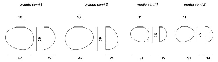 Applique design qui coupe en deux le verre soufflé de la lampe Gregg, une forme organique et asymétrique qui rappelle les inspirations naturelles. Le diffuseur embrasse complètement la source de lumière, qui est disponible en deux orientations différentes.