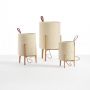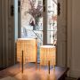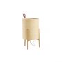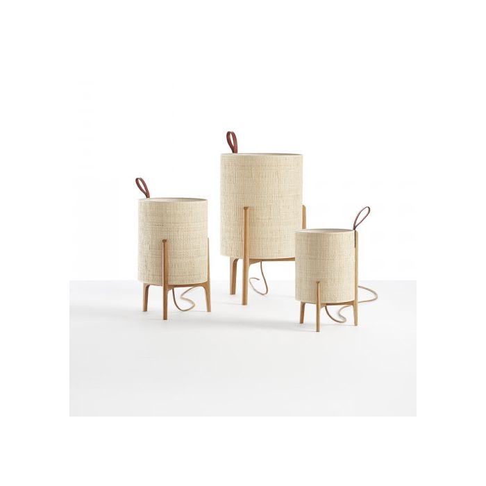 Greta est une lampe de table en bois de chêne et vernis satiné. Abat-jour en fibre naturelle et poignée en cuir naturel.