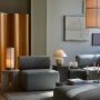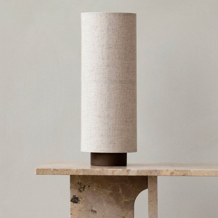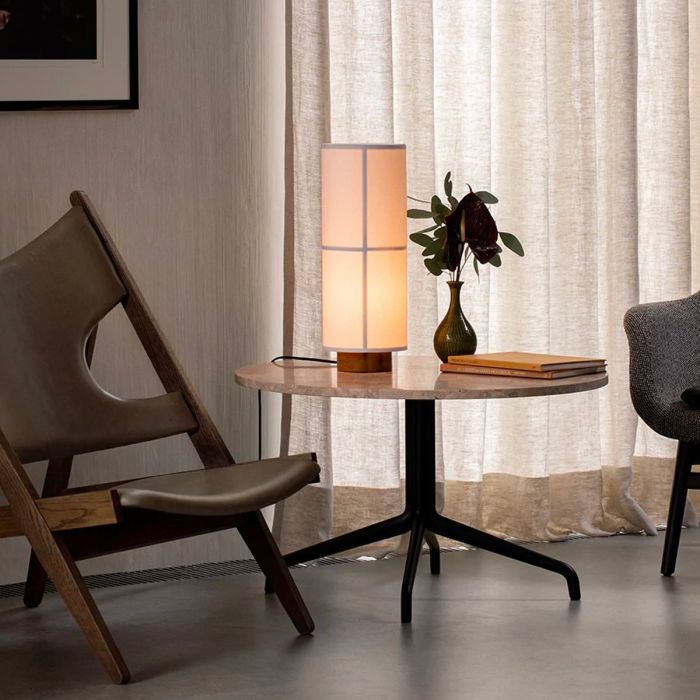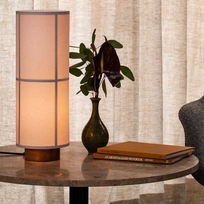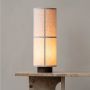 Hashira, lampe de table Façonnée à partir de la forme géométrique de base de l'architecture, la lampe de table cylindrique élancée s'inspire du tissu translucide des lanternes japonaises et des stores pour diffuser doucement la lumière dans plusieurs directions. Il est posé sur une base en frêne qui sous-tend l'expression minimaliste.