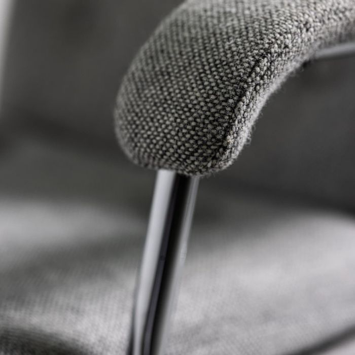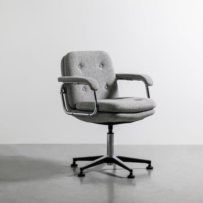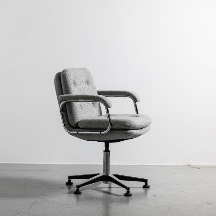Matériaux : accoudoir fixe garni, assise garnie moussé à m’éboule de forme, croix aluminium poli