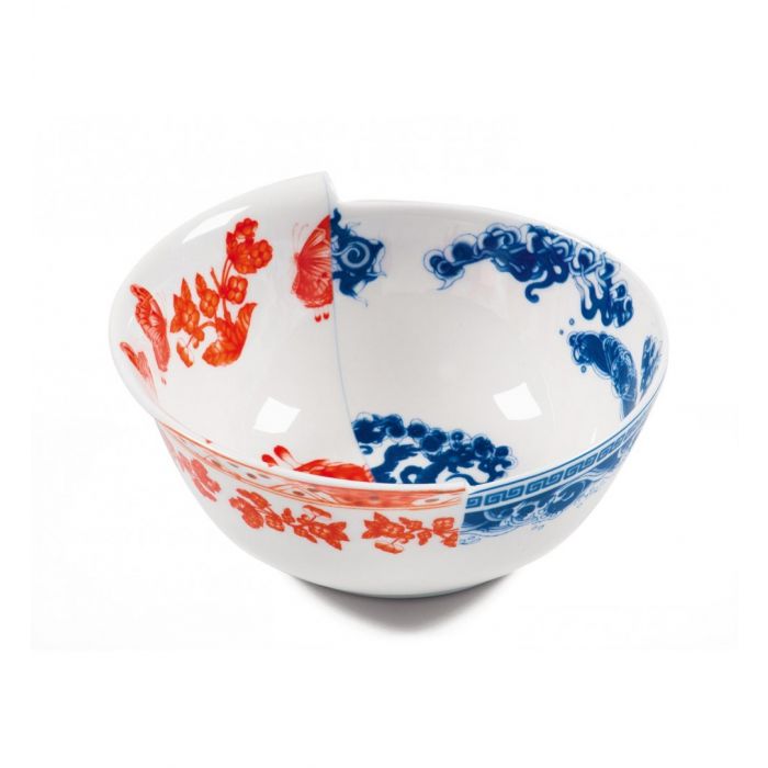 Le bol Eutropia fait partie de la collection Hybrid imaginée par le Studio CtrlZak pour Seletti. L'inspiration du design tire ici ses origines de la fusion entre les savoir-faire d'orient et d'occident. Chaque élément est composé de deux tableaux, de deux scènes différentes séparées par une frontière. Les parties bleutées ou monochromes font clairement appel à la faïence de Delft qui prit son essor en Hollande au XVIIème siècle. Cette faïence se caractérise par des motifs floraux et végétaux, par des scènes champêtres,des scènes de chasse ou bucoliques. L'autre partie des éléments fait référence directement au travail des artisans chinois et à l'imagerie qui le caractérise. C'est avec le kaolin que les chinois ont pu mettre au point la porcelaine, et c'est justement à Tangshan, "la capitale de la porcelaine Bone China" que la vaisselle Hybrid est produite. C'est une porcelaine si fine qu'elle laisse passer la lumière en transparence tout en étant d'une robustesse exceptionnelle. Toutes les finitions sont faites à la main. Ce bol design et atypique apportera une touche d'élégance à votre table.