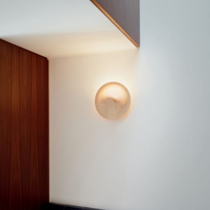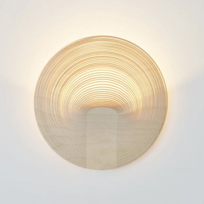 Forme lumineuse, innovation technologique et durabilité sont les caractéristiques de la nouvelle version murale d'Illan conçue par Zsuzsanna Horvath pour Luceplan. L'applique murale Illan est constituée d'un élément en aluminium moulé sous pression fixé au mur, contenant une source LED qui émet une lumière douce et chaude vers le haut. Fixée au moulage, la structure en bois stratifié découpé au laser, extrêmement fine et flexible (diamètre 31 cm) habille le corps de la lampe et détermine le dessin géométrique caractéristique d'Illan. L'abat-jour est obtenu à partir du surplus de production du modèle de suspension Illan, à savoir les chutes de la feuille de bois utilisée pour découper la lampe.