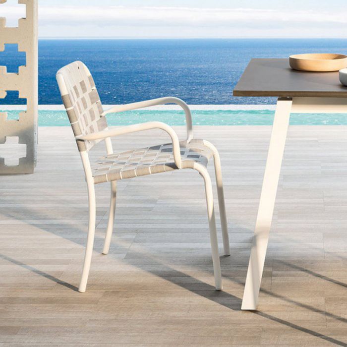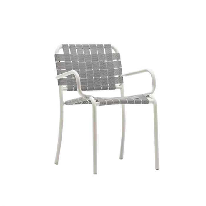 Inout 824 de Gervasoni par Paola Navone. Chaise, structure empilage en aluminium laqué blanc, gris ou sage mat, tressage à sangles élastiques bleu, noir ou gris.