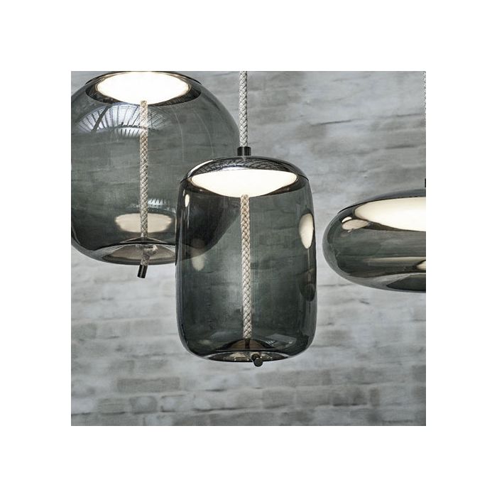 KNOT est une collection de lampes à suspendre majestueuses dans laquelle se confrontent deux matériaux différents, deux principes différents – la douceur des courbes arrondies du verre soufflé transparent et l’austérité d’un câble écru tendu. Le design résultant est à la fois surprenant, rectiligne et digne. Les formes pleines et arrondies des différentes proportions sont tranchées par un câble robuste qui semble déformer le fond en verre et créer ainsi un effet de plasticité et d’élasticité. Le nœud qui se trouve à l’extrémité du câble est l’élément artistique caractéristique du concept. La source de lumière LED est recouverte d’un capot métallique et elle est protégée par le bas par un diffuseur en verre opale soufflé à la main. Un autre composant métallique a été utilisé pour réaliser l’embout du câble. Les lampes de la collection Knot pourront être installées aussi bien dans des intérieurs privés que publics et ce, pas uniquement au-dessus de tables de salles à manger. Cette collection se compose de quatre lampes à suspendre et de diverses variations de couleurs.