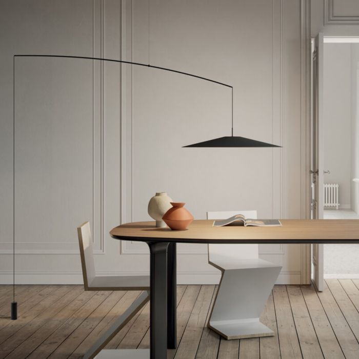 La famille de lampes Koinè de Mandalaki s'agrandit avec une nouvelle solution d'éclairage. A mi-chemin entre la suspension et le lampadaire, la nouvelle Koinè reprend la technologie et le design de la version suspension, désormais dotée d'une structure élégante composée d'une tige longue et fine en carbone, d'un contrepoids cylindrique en acier et d'un variateur à pied. Disponible en finition noir mat (Ø 55cm), Koinè floor s'adapte à différents types d'espaces grâce à la possibilité de régler son inclinaison et sa hauteur lors de l'installation. La source lumineuse, avec sa lentille en verre, éclaire de manière uniforme et distincte.