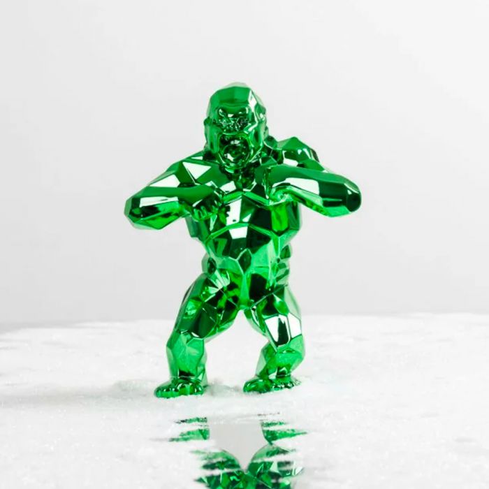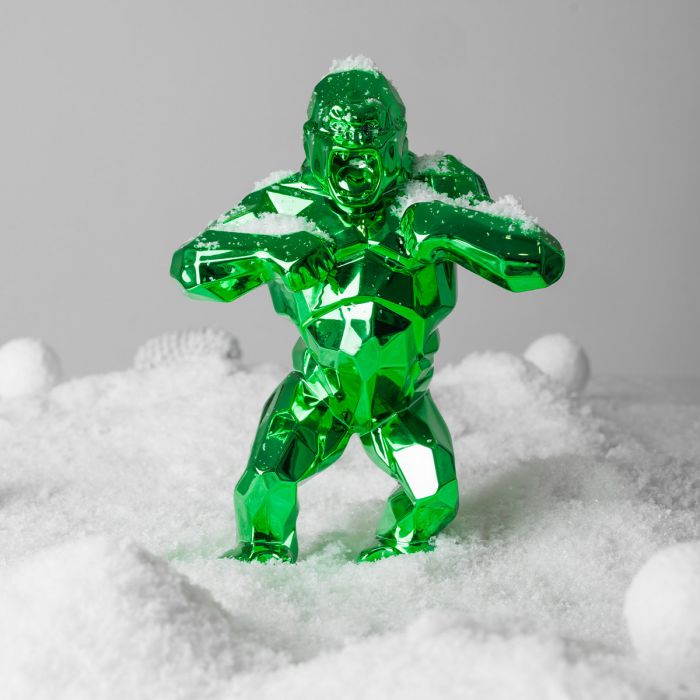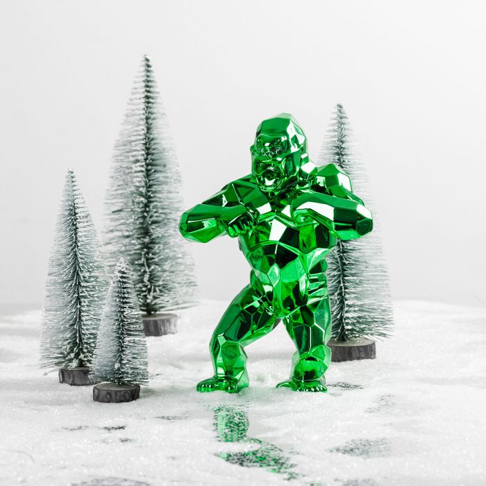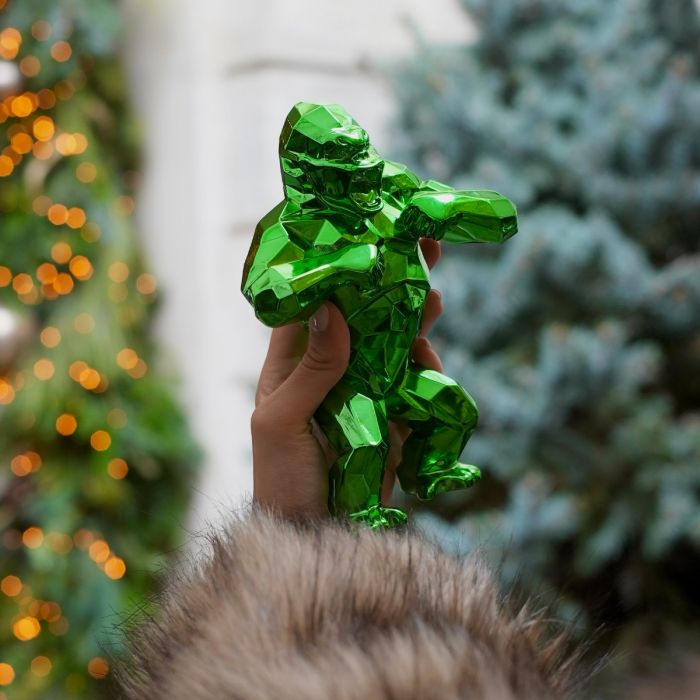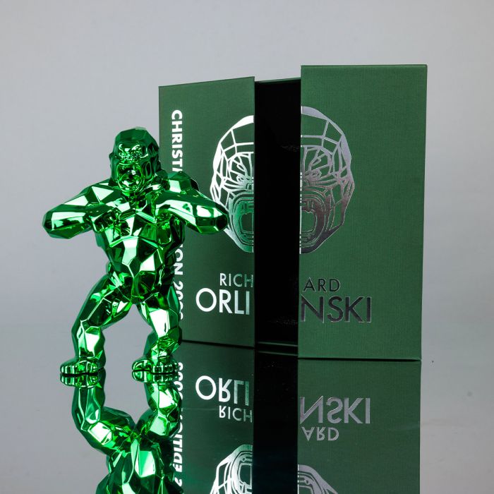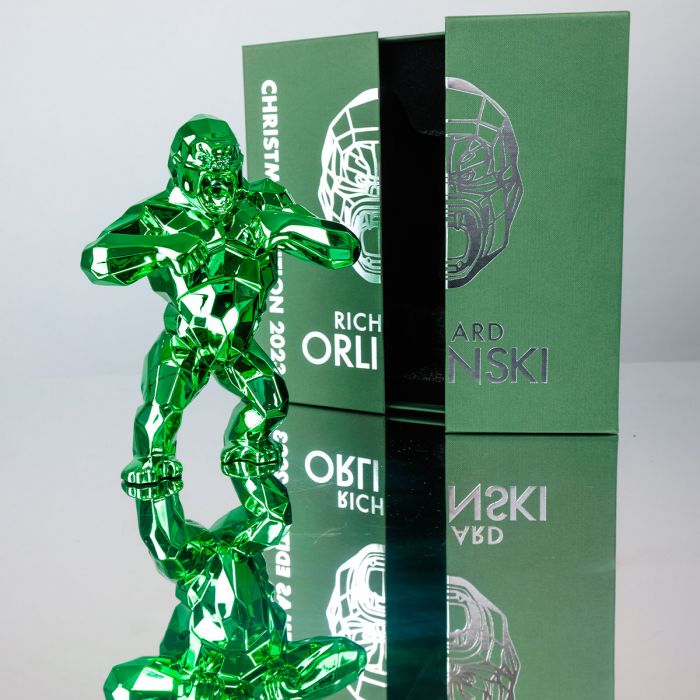 Kong Christmas de Richard Orlinski. Noël ! Un mot, et nous voilà transportés dans un univers féérique : des sapins de toutes tailles qui restent verts même en hiver, des boules et des guirlandes scintillantes, des rues et des vitrines illuminées, des cadeaux à offrir, des cadeaux à recevoir... Pour Noël, Richard a créé un Kong vert étincelant, en hommage aux sapins qui symbolisent la vie et la prospérité avec leur feuillage persistant. Cette sculpture aux facettes ultra brillantes joue avec les lumières, qui l’embellissent d’une multiplicité de nuances variant au gré des reflets. Ce Kong vert vif est précieusement emballé dans un coffret mat vert kaki. Ces 2 finitions se répondent subtilement pour amplifier l’effet de surprise à l’ouverture de la boîte.