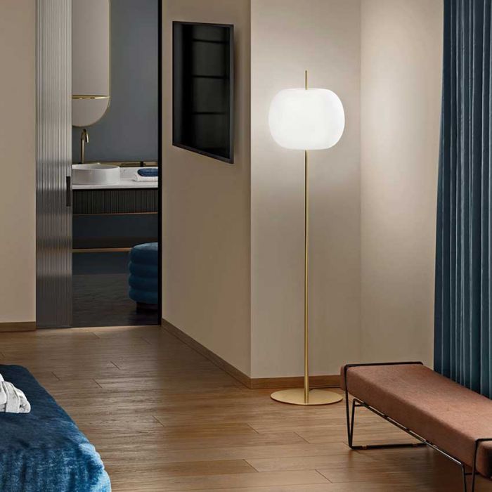 Sobriété, pureté, douceur sont les maîtres mots de ce design ! Ainsi, la baguette métallique, rigide, froide et matériste s'oppose à la douceur veloutée des courbes du diffuseur en verre soufflé et gravé, coexistant dans la même espace, dans une relation continuelle et réciproque, pour donner vie à une collection de lampes très simples dans la forme mais dotées d'une forte personnalité.