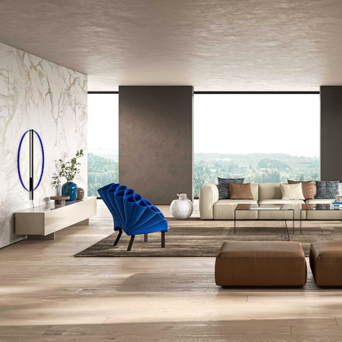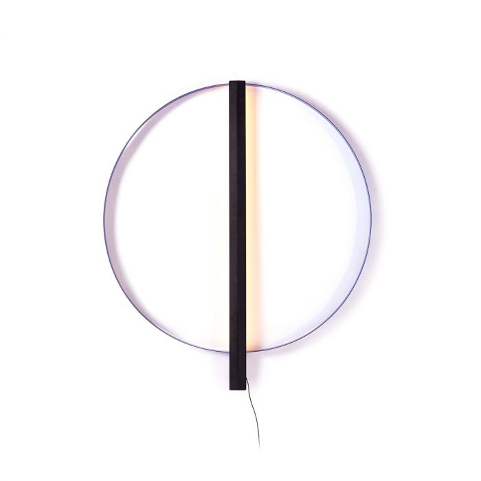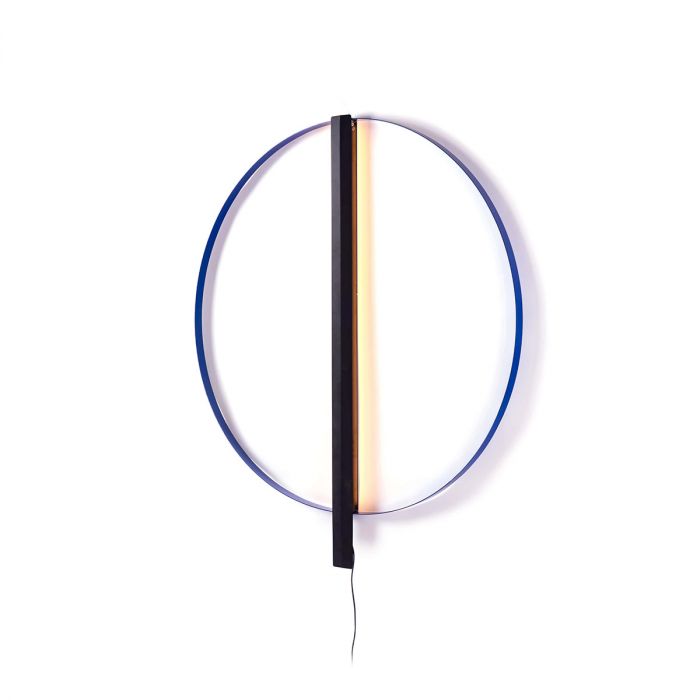 Conçue par le studio suisse Panter & Tourron et présentée pour la première fois en 2022 comme prototype dans la version unique au sol, en 2023 la famille Lampada da Appartamento fait officiellement partie de la collection Cappellini avec à la fois la version au sol et la nouvelle version murale spectaculaire. La structure des lampes est composée d'un élément métallique vertical, peint en noir mat, et de deux arceaux métalliques en finition bleu métallisé : les deux bandes LED à l'intérieur de l'élément central réfléchissent la lumière sur les arcs, créant un anneau lumineux parfait. Caractérisée par sa forme géométrique circulaire, Lampada da Appartamento est un objet minimal aux dimensions immenses, capable de meubler n'importe quel environnement de manière très sculpturale.