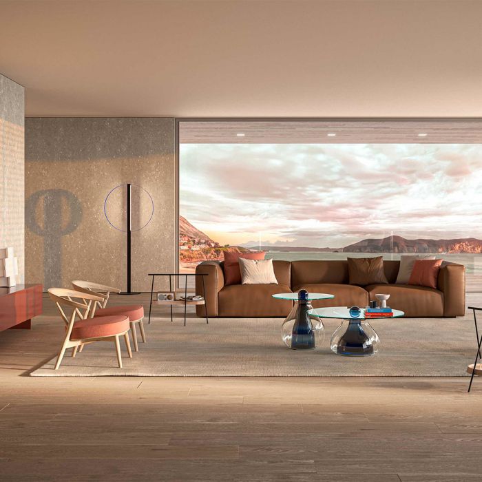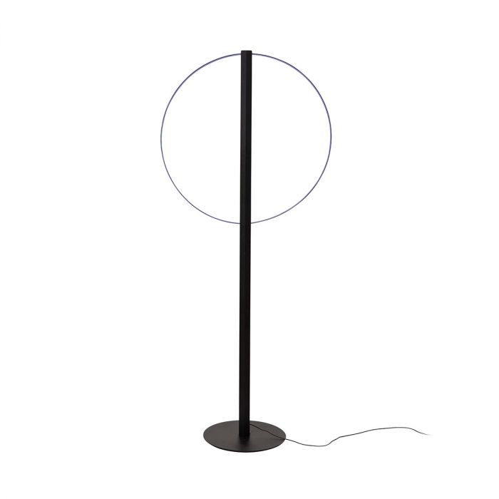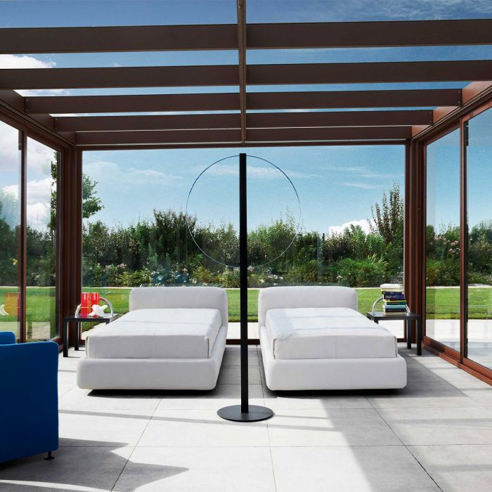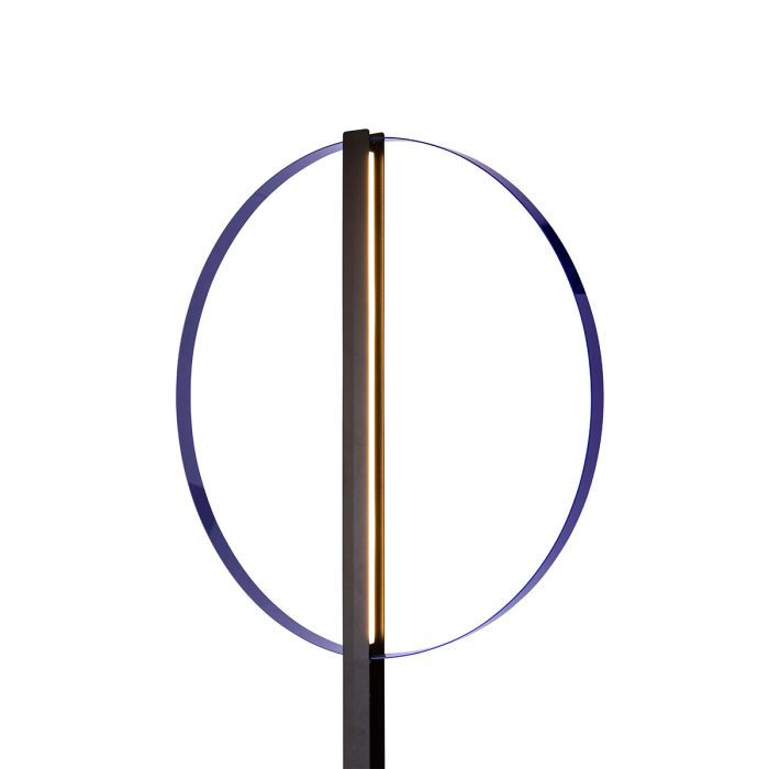 Conçue par le studio suisse Panter & Tourron et présentée pour la première fois en 2022 comme prototype dans la version unique au sol, en 2023 la famille Lampada da Appartamento fait officiellement partie de la collection Cappellini avec à la fois la version au sol et la nouvelle version murale spectaculaire. La structure des lampes est composée d'un élément métallique vertical, peint en noir mat, et de deux arceaux métalliques en finition bleu métallisé : les deux bandes LED à l'intérieur de l'élément central réfléchissent la lumière sur les arcs, créant un anneau lumineux parfait. Caractérisée par sa forme géométrique circulaire, Lampada da Appartamento est un objet minimal aux dimensions immenses, capable de meubler n'importe quel environnement de manière très sculpturale.