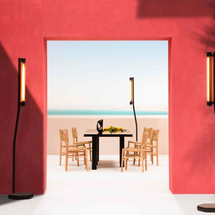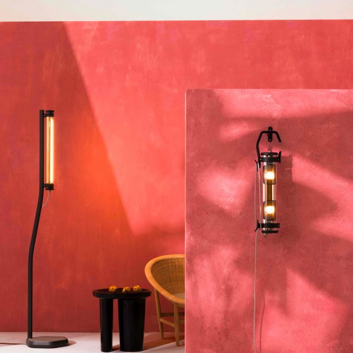 Matériaux : tube en polycarbonate qualité cristal, mât en aluminium laqué, réflecteur en aluminium anodisé