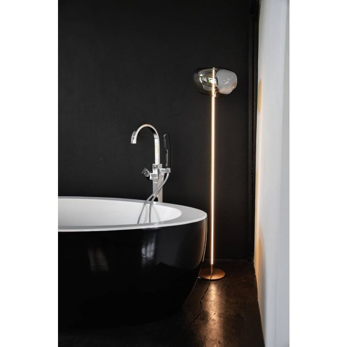 Le lampadaire design G-222 combine un style minimaliste et aérien. Le lampadaire à éclairage variable se compose d’un tube en aluminium rainuré d’où s’extrait une lumière discrète et fonctionnelle et d’un galet de verre italien soufflé à la bouche. Ce galet interchangeable s’ajuste selon vos envies mais également aux ambiances de votre intérieur.