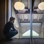Matériaux : verre soufflé satiné à l’acide, métal et polyuréthane vernis