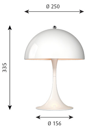 Le luminaire émet une lumière douce et feutrée. La version métallique dirige la lumière directement vers le bas, créant un éclairage doux et confortable grâce à un abat-jour peint en blanc à l'intérieur et à l'effet réfléchissant de son pied en forme de trompette. La version acrylique diffuse une atmosphère lumineuse confortable grâce à sa couleur et à son abat-jour interne réfléchissant la lumière vers le bas. Il existe à présent deux nouvelles versions de la lampe Panthella Mini, en finitions chrome brillant et laiton metallisé.