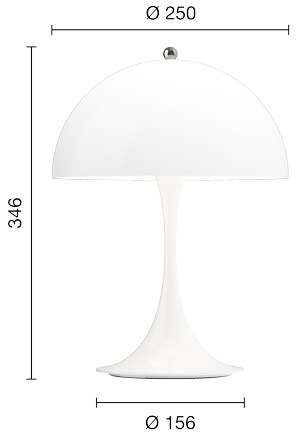 Panthella mini est une lampe designé par Verner Panton pour la marque Louis Poulsen. Le luminaire émet une lumière douce et feutrée. La version métallique dirige la lumière directement vers le bas, créant un éclairage doux et confortable grâce à un abat-jour peint en blanc à l'intérieur et à l'effet réfléchissant de son pied en forme de trompette. La version acrylique diffuse une atmosphère lumineuse confortable grâce à sa couleur et à son abat-jour interne réfléchissant la lumière vers le bas. Il existe à présent deux nouvelles versions de la lampe Panthella Mini, en finitions chrome brillant et laiton metallisé.