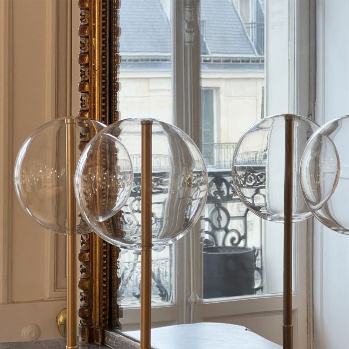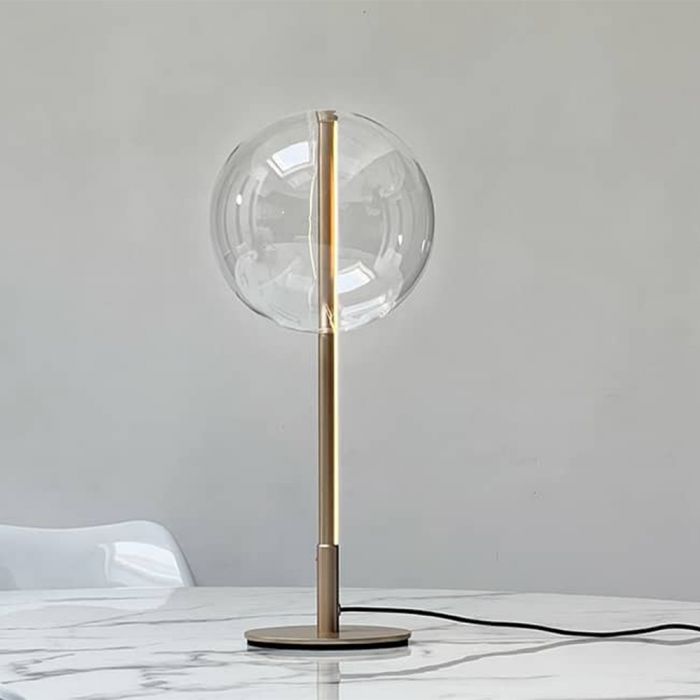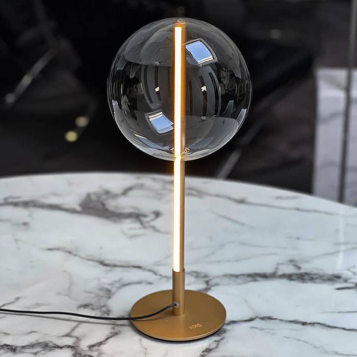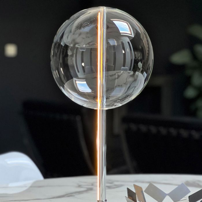 La lampe de table design B-111 au style minimaliste et vintage technique dans un esprit résolument 70’s. La lampe à éclairage variable se compose d’un tube en aluminium rainuré d’où s’extrait une lumière discrète et fonctionnelle et d’une bulle de verre italien de 20 cm de diamètre, soufflé à la bouche.