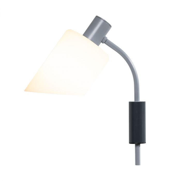 Partant de la nécessité d'éclairer les visages reflétés dans le miroir d'un meuble conçu pour la célèbre verrerie française Boussois, Charlotte Perriand conçoit en 1965 la version murale de la Lampe de Bureau. Le corps présente des tons gris, tandis que le diffuseur en verre pressé translucide est disponible dans les finitions extérieur vert, rouge, bleu jument, bleu gris, jaune et blanc mat . À l'intérieur, la finition blanche préserve la couleur naturelle de la lumière. Pour un positionnement flexible de la lumière, une rotation de 120 degrés du corps est prévue.