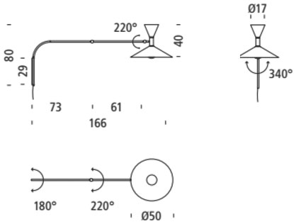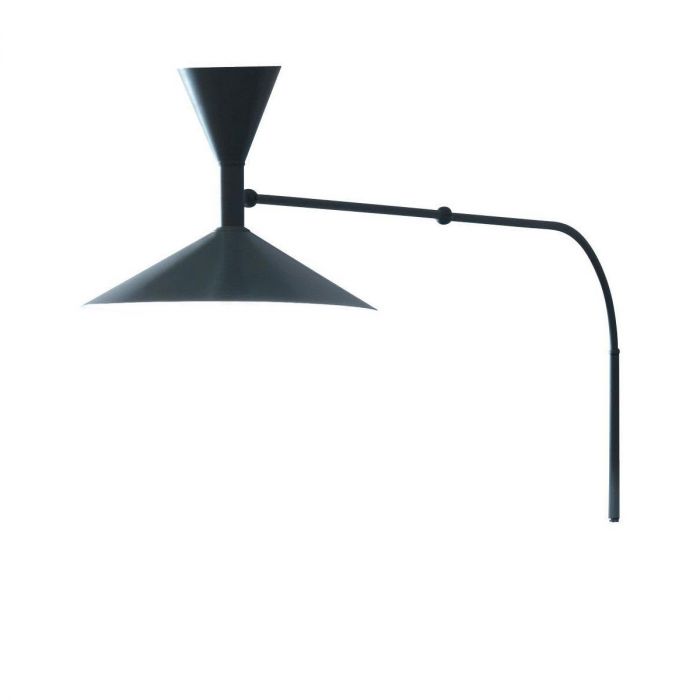 Applique Le Corbusier avec un bras déporté, connu sous le nom de La lampe de Marseille. Cette applique murale est une réédition de la lampe de Le Corbusier de 1954. Inspirée de l'éclairage industrielle de l'époque, cette applique est munie d'un abat-jour composé de deux cônes asymétriques, proposant deux sources lumineuses (direct et indirect), fixé sur un bras orientable. L'abat-jour est pivotant et son bras long peut aller jusqu'a 166cm.