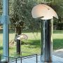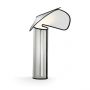 Lampe de table composée d'un corps réfléchissant en aluminium, fini intérieurement avec un film plastique blanc opaque et plié et fermé via des crochets rivetés à la métal talon. Un joint coloré en caoutchouc moulé parcourt tout le profil du corps. La base interne en aluminium extrudé est fixée au corps pour plus de stabilité et supporte également la douille d'ampoule. Le câble d'alimentation a un variateur pour régler la luminosité. Longueur de câble utile: 1,9 m.