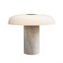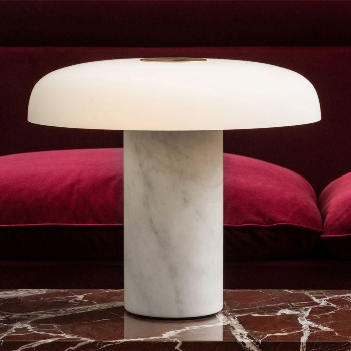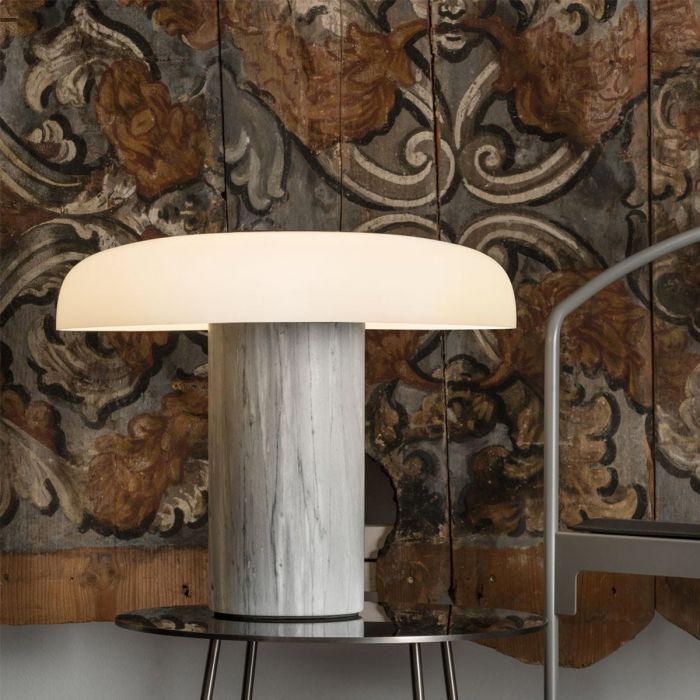 Lampe de table à lumière diffuse dimmable. Structure en marbre blanc de Carrare, gris Bardiglio ou noir Marquinia. Diffuseur en verre soufflé opalin dépoli à l'acide. Bouton central en métal galvanisé. Câble d'alimentation, variateur et prise noirs.