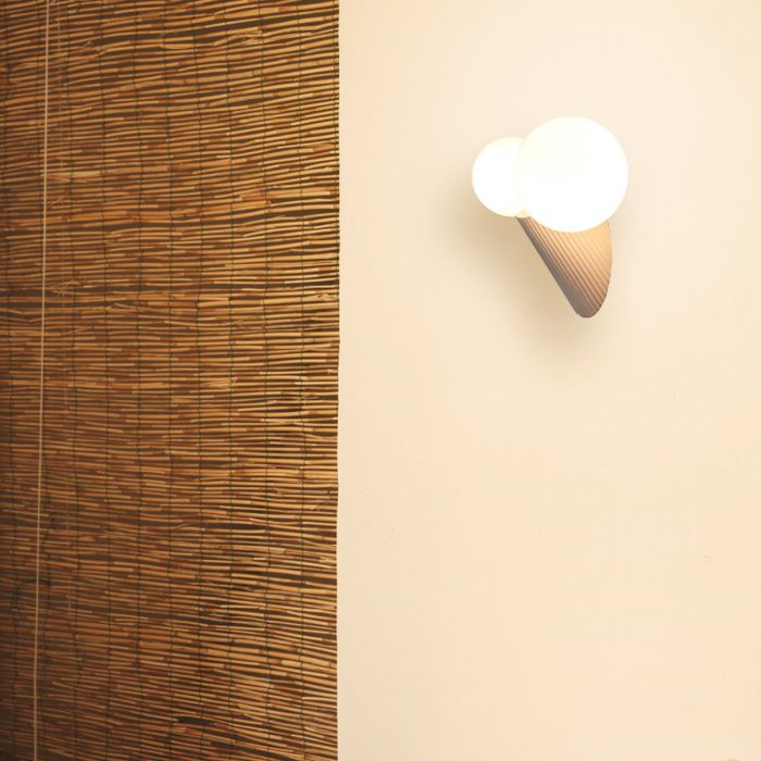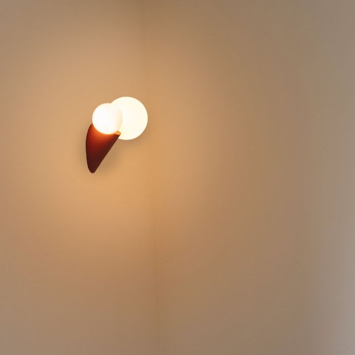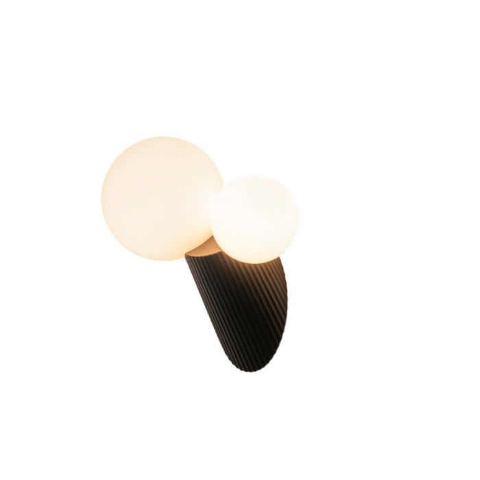 Land est une applique murale avec des diffuseurs de 10 et 14 cm de diamètre, en verre soufflé opale brillant. Support en verre qui le relie à la base en polycarbonate injecté, finition blanche. Fixation par système de filetage. Bases en céramique avec finition peinture acrylique. Système de fixation murale par aimants néodyme sur la base.