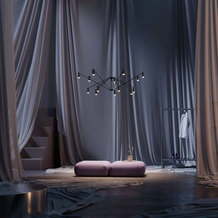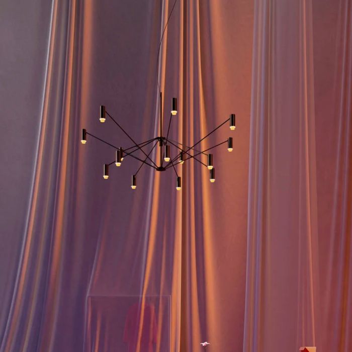 Dépliez la lumière ou pliez-la avec Le W. La dernière-née de PerezOchando est une lampe flexible de grand format conçue pour s'adapter aux différentes exigences d'éclairage dans les grands espaces. Une grande structure verticale noire est le puits principal d'où émergent un certain nombre de tiges; certains peuvent être déplacés vers le haut pour étendre la lumière et d'autres vers le bas pour la focaliser. Les tiges ont toutes un projecteur suspendu qui projette la lumière vers le bas ou dans un faisceau large et net. Les spots cylindriques – avec un anneau intérieur disponible en ivoire, en terre cuite ou en or – diffusent la lumière uniformément. Ce luminaire décoratif, au profil extrêmement graphique et facile à tracer, s'inspire d'un bobinoir à l'ancienne : utilisé pour enrouler du fil ou du fil autour d'un axe et former une boule. Les designers Pedro Ochando et Claudia Pérez ne s'intéressent pas à la fonction de la machine, mais plutôt à sa forme, qui permet un mouvement vertical avec un effet horizontal. Un design léger, sobre et fonctionnel avec une grande présence qui peut changer de forme, s'ouvrir pour étendre la lumière jusqu'à un diamètre de 2 mètres pour les grands espaces, ou se replier jusqu'à 1,2 mètre de diamètre pour se concentrer sur une zone plus petite. Les concepteurs disent que se tenir sous la lampe ouverte donne l'impression d'être sous un dôme de lumière. Sa principale caractéristique est que, quelle que soit sa taille, il offre toujours un éclairage d'ambiance exceptionnel.