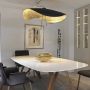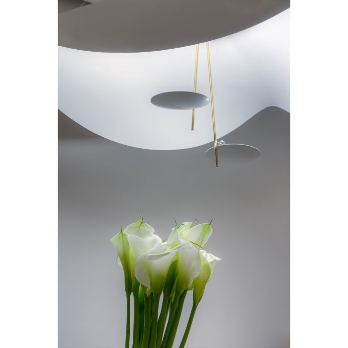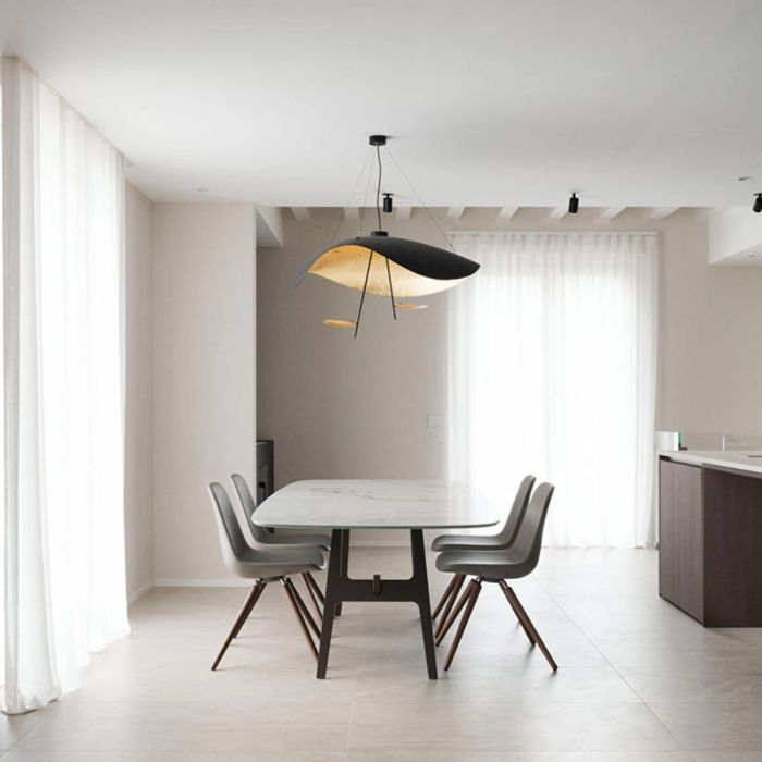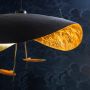 La suspension S2 est une création chic et tendance. Son esthétique particulière nait de la rencontre entre deux éléments contrastés : un grand abat-jour, simple et épuré, renfermant une construction sophistiquée. La forme fluide et dynamique du grand abat-jour en fibre de verre évoque un tissu qui flotterait au gré du vent. Il recouvre une construction géométrique aux accents art déco. Cette structure architecturale, fine et élégante, se compose de deux coupoles qui jouent les équilibristes sur des tiges obliques en métal doré. Les coupoles sont rotatives (360°) afin d'orienter la lumière selon vos besoins. Les lampes Catellani & Smith sont fabriquées à la main par différents artisans. La suspension Lederam Manta S2 est écologique, grâce à son système d'éclairage basse consommation LED. Elle vous fait profiter d'une classe énergie type A+++ pour éclairer en douceur sans culpabiliser ! La lampe est issue de la gamme eco-logic light, qui propose des luminaires en énergie LED, qui consomme environ 5 fois moins qu'une ampoule normale, qui vous fera faire des économies et en plus, vous pourrez faire un geste pour notre précieuse planète.