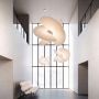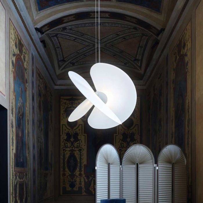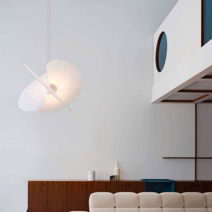 Un lustre de grand impact émotionnel, basé sur l'intuition créative du designer, ainsi que sur la recherche sur les matériaux, la technologie et le design menée par di Luceplan. Un nouveau protagoniste pour les espaces de vie de la maison, mais aussi pour les applications contract. La taille est impressionnante, mais l'image globale est éthérée, comme un organisme flottant dans l'espace. Levante (le nom suggère légèreté et vent, mais aussi une référence claire à l'esthétique orientale) découle de l'intersection de trois grands éventails, réalisés dans un matériau sans précédent pour le secteur du design, emprunté au monde de l'alimentation, avec un aspect similaire au riz papier, pour diffuser la lumière de manière uniforme sur les surfaces. L'épaisseur des voiles est minime et ils sont attachés avec des aimants au noyau central qui contient la source lumineuse, cachée comme s'il s'agissait d'un cœur organique battant.