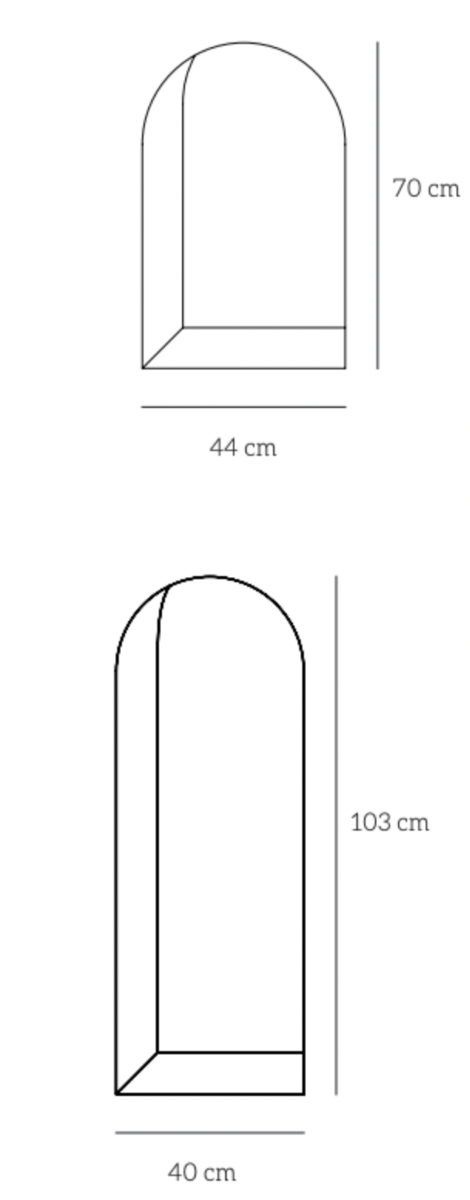 Ces miroirs sont inspirés de l'architecture métaphysique de l'architecture, des chateaux et anciennes fenêtres. Deux puissantes lignes de couleurs sont imprimées sous le verre et reflètent la lumière pour créer un aspect de perspective. Disponible en deux tailles et couleurs différentes, ils peuvent être disposés seul ou en groupe.