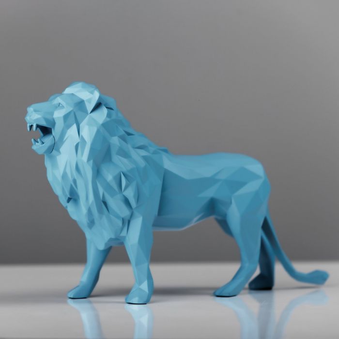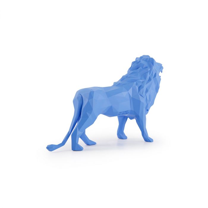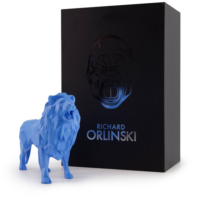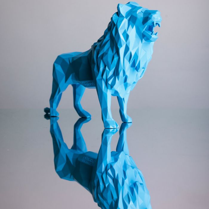 Lion de Richard Orlinski. En attribuant le bleu du ciel à son lion, Richard Orlinski associe la force et la férocité du félin à la douceur de cette couleur. L’artiste a choisi de peindre sa sculpture dans un bleu apaisant et mat… Une transgression qui transforme notre vision du roi de la jungle. Bien sûr, sa gueule est menaçante et son encolure hérissée de facettes subtilement sculptées et impressionnantes ! Mais la beauté du Lion (Matt Blue) nous donne envie de l’apprivoiser.
