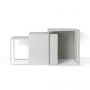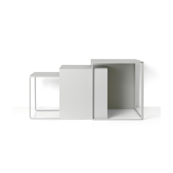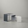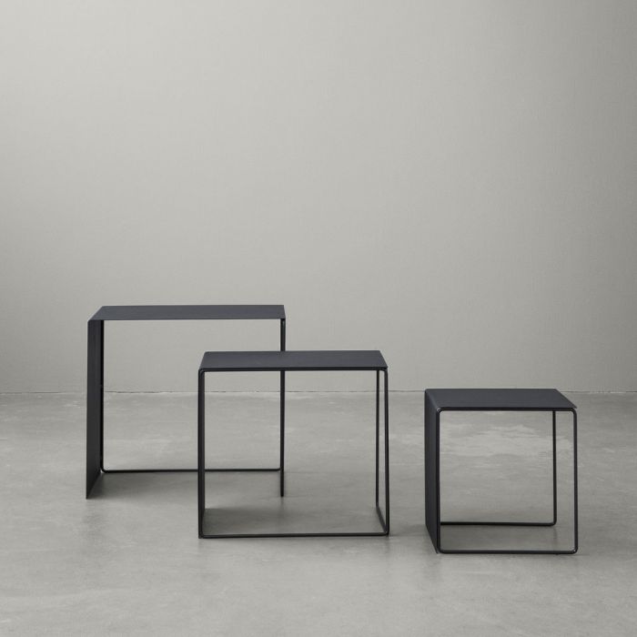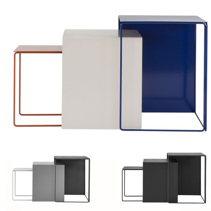 Cet ensemble de trois tables basses en métal de différentes hauteurs peut être disposé séparemment ou réuni devant un canapé pour créer une composition design. Ces trois tables s'imbriquent les unes aux autres et vous permettent de gagner de l'espace. La personnalité et l'allure ultra contemporaine de cette collection réside dans sa structure étant composée de fils d'aciers et d'un plateau et un côté du piètement plein. Cette alliance de pleins et de vides leur confère un design original et élégant.