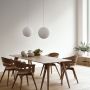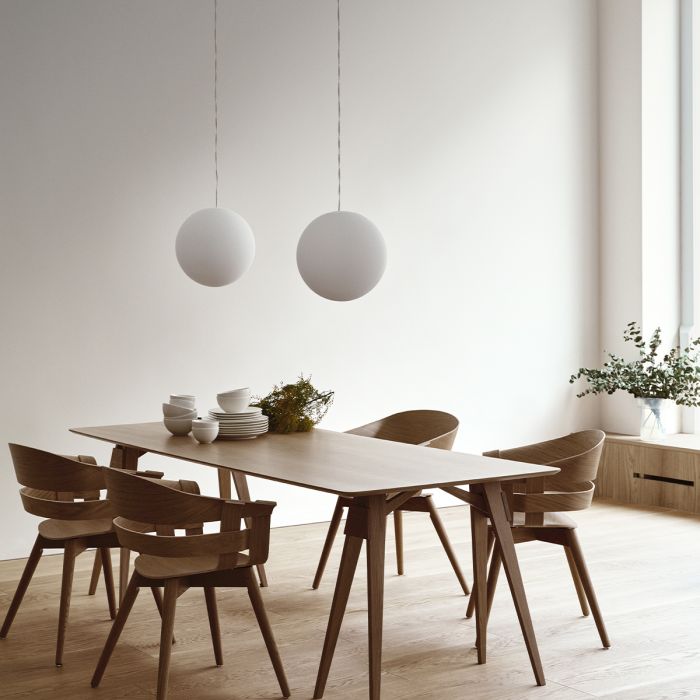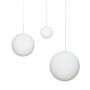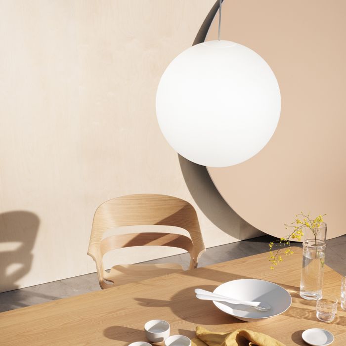 La solution a consisté à intégrer le couvercle au globe lui-même : il est caché, mais plus facile à manipuler que n’importe quel autre globe. Un souffleur de verre expérimenté de l’usine de verre polonaise a suggéré d’utiliser une vieille machine oubliée qui permet de polir les bords du globe et le couvercle à tolérance zéro. Sur les globes opaques comme sur les globes en cristal, le couvercle est un composant invisible intégral, et il a enfin perfectionné le concept du globe. Complété par une croix en acrylique transparent, le reste de la structure suspendue et les câbles électriques sont assemblés en un seul cordon. « Si vous voulez façonner un espace intérieur avec de la lumière, vous avez vraiment besoin d’une source lumineuse sans compromis. Il n’est donc pas étonnant que mon rêve ait été un globe aussi parfait que la pleine lune, sans ombres – juste une lumière irisée pure », explique Alexander. Sa carrière de designer a produit des surprises lumineuses, avec une poignée de porte lumineuse et une valise incandescente ; il a également illuminé des images 3D de scanners cérébraux, le tout dans cet espace passionnant entre l’art et le design. La nouvelle version en cristal Luna est livrée avec une ampoule LED de forme spéciale, qui améliore encore le design de la lampe. La version cristal est disponible dans les tailles M et L, la version opaque est également disponible en S ; toutes sont dimmables. La version opaque XL est 50 % plus grande que la version L, offrant un diamètre de 60 cm. Et pourtant : elle n'a pas de mécanisme de suspension ni de couvercle visible, et un seul câble. Ajoutez le support Kosmos en métal laqué blanc ou noir pour accentuer encore davantage le contraste entre la lumière et l'espace.