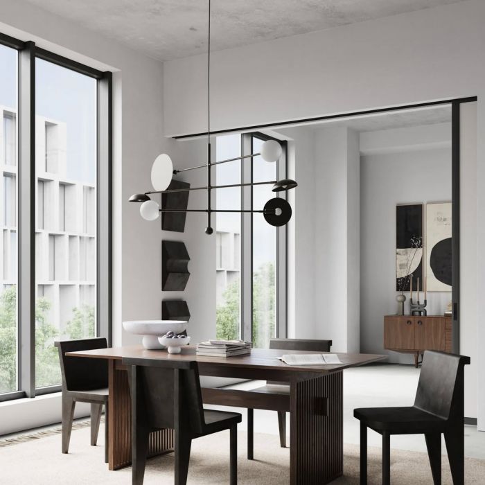 Inspiré du design futuriste des années 70 et de l'ère spatiale, le lustre Sahn est synonyme de mouvement et de flexibilité. Chaque bras de lampe et abat-jour peuvent tourner et se tordre dans différentes directions, soulignant un éclairage unique et sculptural de la pièce. Sahn, le mot japonais signifiant trois, se caractérise par l'utilisation de trois abat-jour différents, dont certains sont devenus synonymes du design d'éclairage classique de 101 Copenhagen. Chacun des trois abat-jour offre une expérience lumineuse différente, ajoutant une fonctionnalité riche et ludique à la lampe.