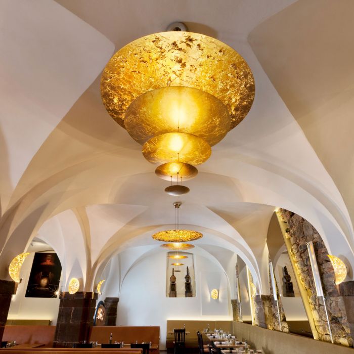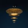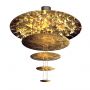 Etonnantee par sa beauté et sa forme généreuse, cette suspension sublimera votre intérieur par sa douceur et son côté "zen". La suspension existe en plusieurs modèles composés de deux à cinq disques réflecteurs de diamètres différents. Les disques sont revêtus de feuille couleur or, argent ou cuivre. La suspension séduit par son élégance et son design, elle est idéale pour les grands espaces.