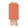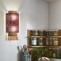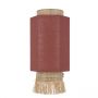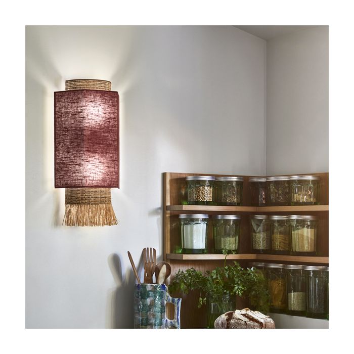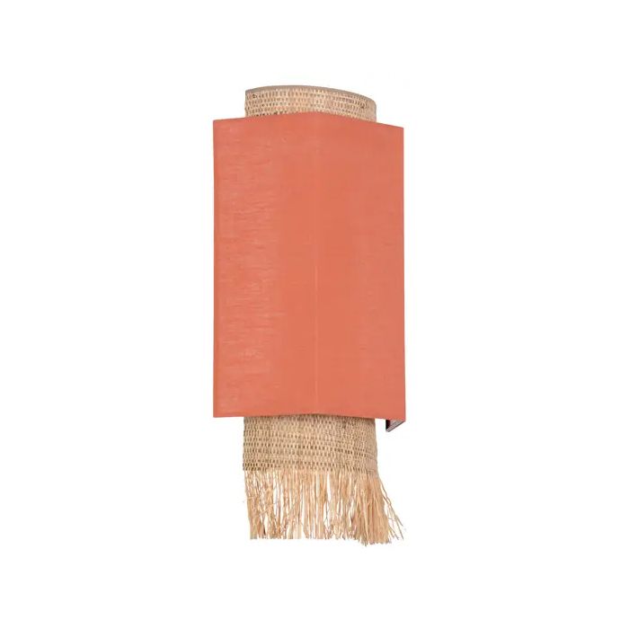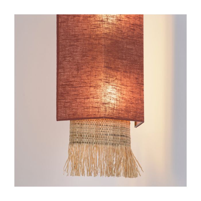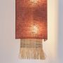 Applique 2 lumières demi-hexagone empilement 3 abat-jour en lin lavé et demi cercles en banc et raphia frangé.