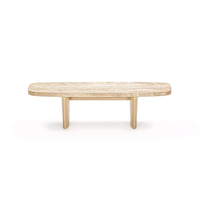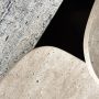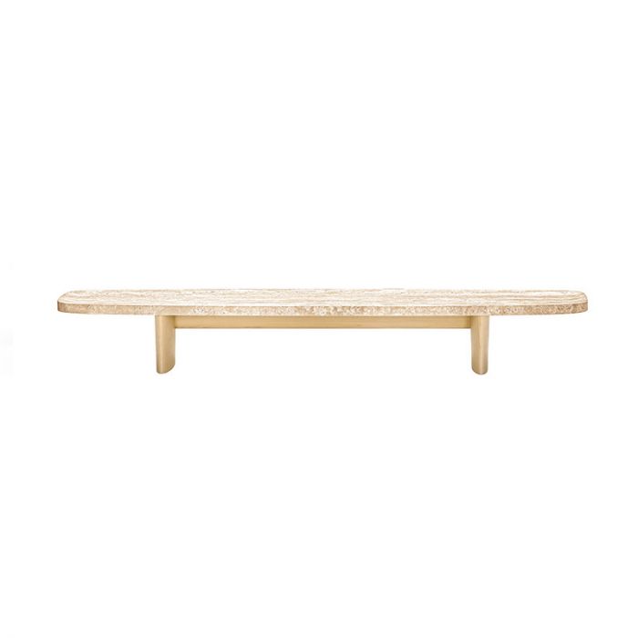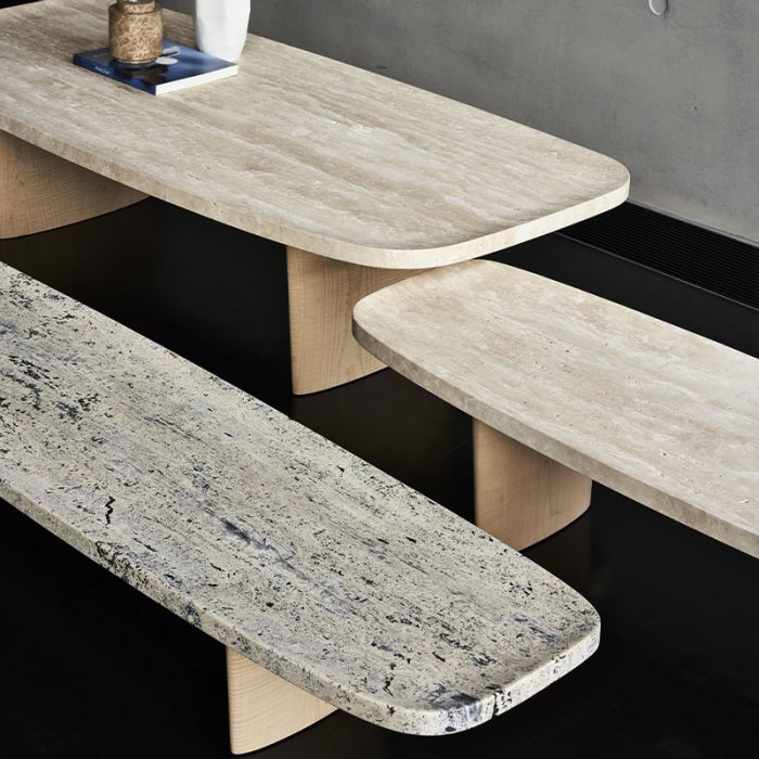 À y regarder de plus près, l'aspect presque monochrome se révèle comme un jeu de pierre de travertin à pores ouverts et de bois.