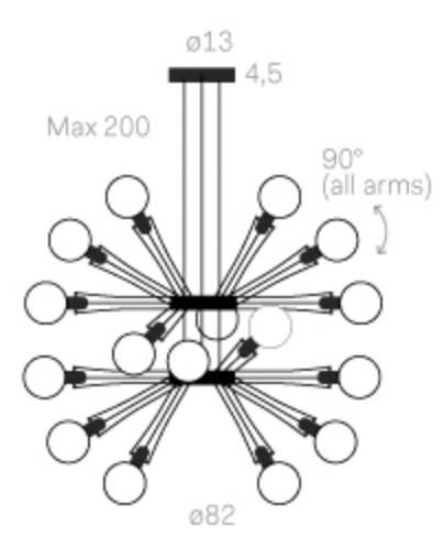 MATRIX DOPPIA est une suspension constituée de deux organes centraux et de seize bras. Les bras peuvent être déplacés verticalement, ce qui permet à la suspension de parfaitement utiliser l'espace. Les bras s'articulent très facilement et ne demandent aucune position centrale ni symétrique. On aime le style industriel de la MATRIX.