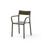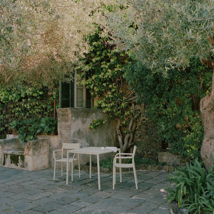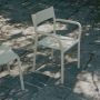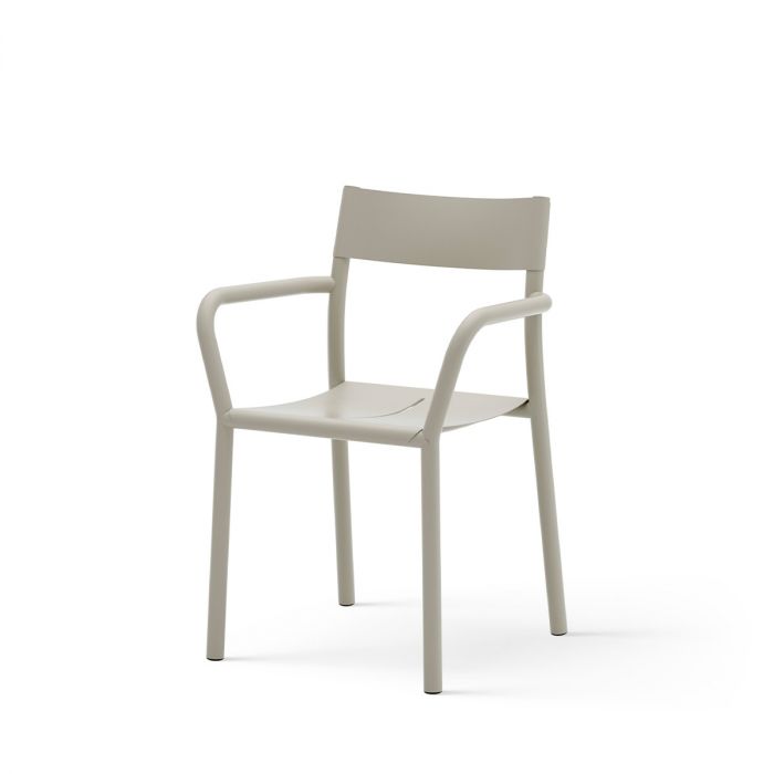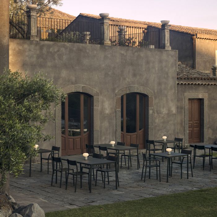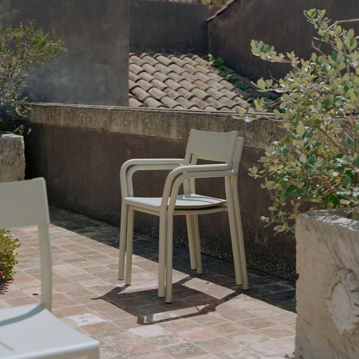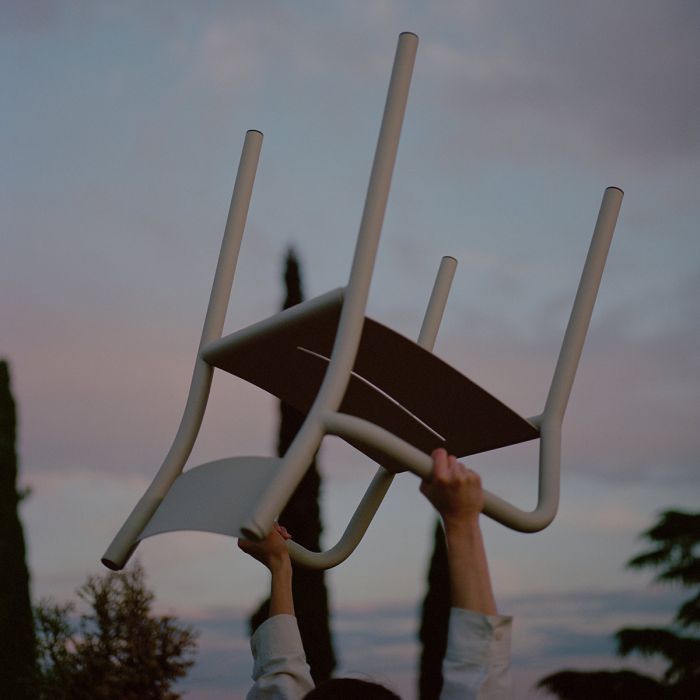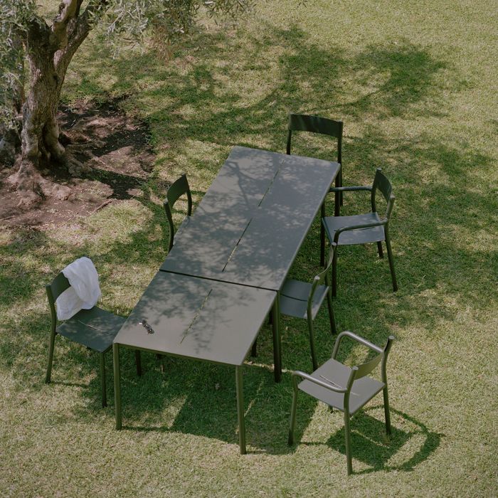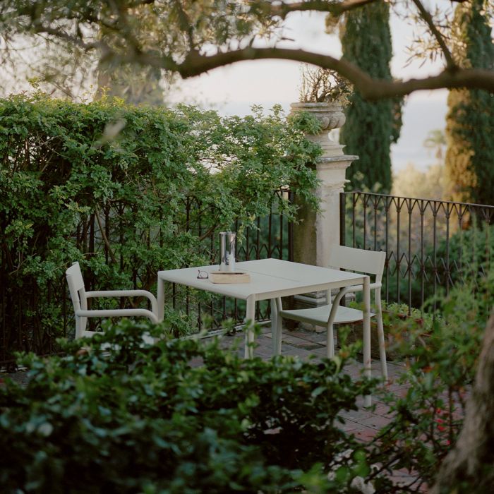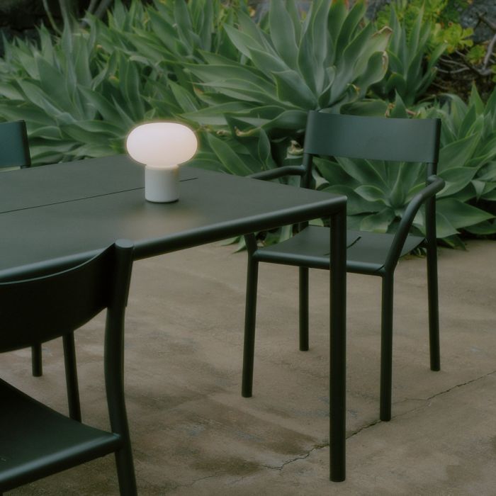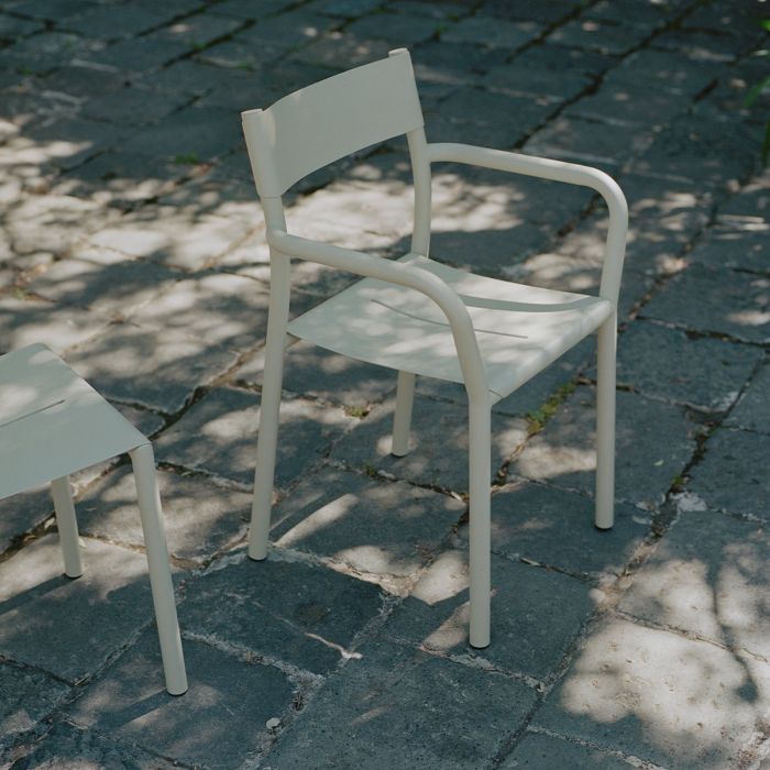May de New Works par Hannes & Fritz. La série May dévoile l'univers New Works avec des meubles pour le jardin, la terrasse ou le balcon. La famille de meubles durables est fabriquée en acier thermolaqué et se compose de chaises empilables avec et sans accoudoirs et de tables en deux longueurs, harmonieusement coordonnées pour se compléter. Le look sobre et monochrome de la famille May est détaillé sans être technique. La chaise montre la voie aux interactions déterminantes du design, où une surface délicate rencontre un cadre solide et entre dans une coexistence étonnamment confortable. Lorsque la plaque d'acier légère s'enroule étroitement autour du gros cadre en acier, elle forme un siège solide et confortable, légèrement incurvé pour épouser doucement le corps. Une fente à travers le siège permet l'évacuation de l'eau et ajoute un détail subtil à la surface autrement unie. Un détail qui réapparaît sur les tables et crée une répétition de lignes qui apporte légèreté, direction et unité à la famille.