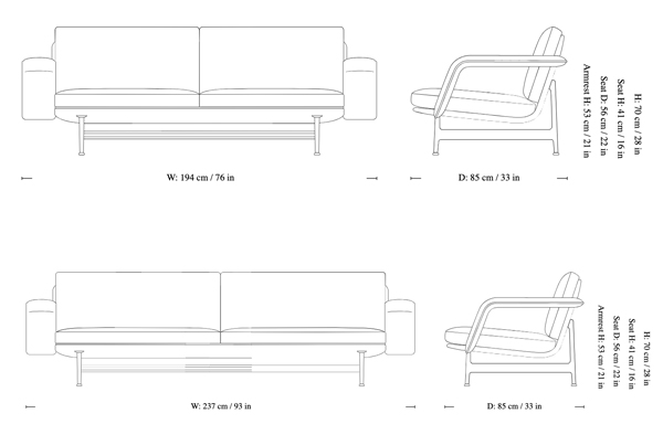Matériaux : cadre en contreplaqué, mousse HR, ouate de polyester, acier, aluminium poli ou thermolaqué, tissu ou cuir